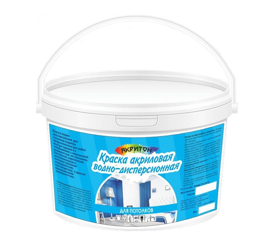 Назначение: Краска водно-дисперсионная для потолков Акритон предназначена для работ внутри зданий и в помещениях с нормальной влажностью по гипсовым, бетонным, кирпичным, шпатлеванным и оштукатуренным поверхностям, гипсокартону, и другим минеральным поверхностям. Способ применения: Перед применением краску при необходимости размораживают при t(20 ± 5) °С, тщательно перемешивают и при необходимости, но не более 5%, разбавляют водой, фильтруют через два слоя марли. Краску наносят на подготовленные по ГОСТ 8832, разд. 3, поверхности кистью, валиком или пневматическим распылением. Краску наносят в два слоя с промежуточной сушкой 1 ч при температуре 18 - 22 °С. Допускается лёгкое отмеливание. Свойства: Практически без запаха, нетоксична, пожаро-взрывобезопасна, экологически безопасный материал. Условия нанесения: Температура воздуха и обрабатываемой поверхности от +5oС до +35oС. ,влажность воздуха 65±5%. Расход на однослойное покрытие: Расход краски на однослойное покрытие составляет 110-170 г\м.кв Допускается подколеровка краски водными пигментными пастами. Высыхание: 1-1,5 часов при температуре воздуха +20* и относительной влажности 65% Краску хранить в плотно закрытой таре при температуре выше 0 °С. Допускается хранение краски при температуре до минус 40 °С в течение не более 1 мес. В случае замораживания краску следует разморозить при комнатой температуре и перемешать до получения однородной массы. Гарантийный срок хранения: 12 мес. со дня изготовления Меры предосторожности: Краска пожаровзрывобезопасна. Не смешивать с другими красками и разбавителями. При попадании в глаза немедленно промыть водой и обратится к врачу. Состав: Латекс акриловый, диоксид титана, наполнители, мрамор молотый, загуститель, технологические добавки, вода