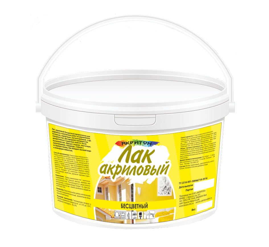 Назначение: Лак акриловый бесцветный предназначен для наружных и внутренних работ по деревянным, бетонным, кирпичным, оштукатуренным, и др. поверхностям. Для придания поверхностям декоротивных и защитных свойств. После высыхания лак образует гладкую, эластичную, полуглянцевую, глянцевую, стойкую к истиранию пленку. Лак обладает высокой водо- и атмосферостойкостью. Способ применения: Подготовка поверхности – Перед нанесением Лака необходимо ответственно подготовить поверхность. Поверхность должна быть чистой, прочной, сухой, очищенной от пыли, грязи, от отслоившейся и непрочно держащейся старой краски, при необходимости обезжирена. Поверхность рекомендуется покрыть Грунтовкой акриловой которая укрепит поверхность, придаст ей отличные поверхностно-сцепляющие свойства, увеличит адгезию (сцепление). Нанесение: Перед нанесением лак тщательно перемешать. Лак наносят кистью, валиком или краскопультом. Рекомендуется двухслойное нанесение, с сушкой между слоями – 6ч. Для снижения вязкости лак можно разбовлять водой но не более 10% Свойства. Практически без запаха, нетоксичный, пожаро-взрывобезопасный, экологически безопасный материал. Условия нанесения. Температура воздуха и обрабатываемой поверхности - от +5oС до +35oС. , влажность воздуха - 65±5%. Расход: Расход краски на однослойное покрытие составляет 110-200 г\м.кв Срок годности: 1 год со дня изготовления. Хранение и транспортировка: В закрытой оригинальной упаковке при температуре от +5С до +30С. В *морозостойком исполнении возможно хранение и транспортировка при температуре до -25С не более одного месяца. Меры предосторожности. При попадании материала в глаза необходимо сразу промыть их большим количеством воды. При попадании эмали на кожу снять ее ватным тампоном и промыть загрязненный участок обильным количеством воды. Время полного высыхания: На отлип – 1 часа. Для нанесения 2-го слоя – 5 часов. Полное – 24 часа. Расход: 150-200 г/м2 Состав: Латекс акриловый, загуститель, технологические добавки, вода