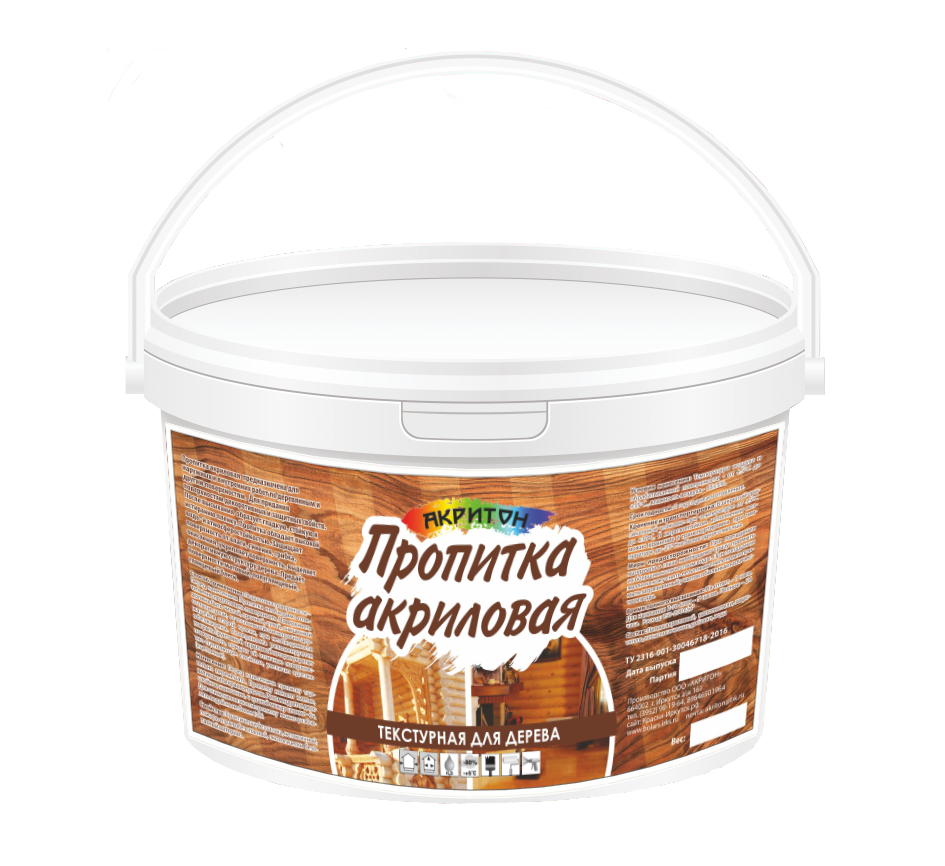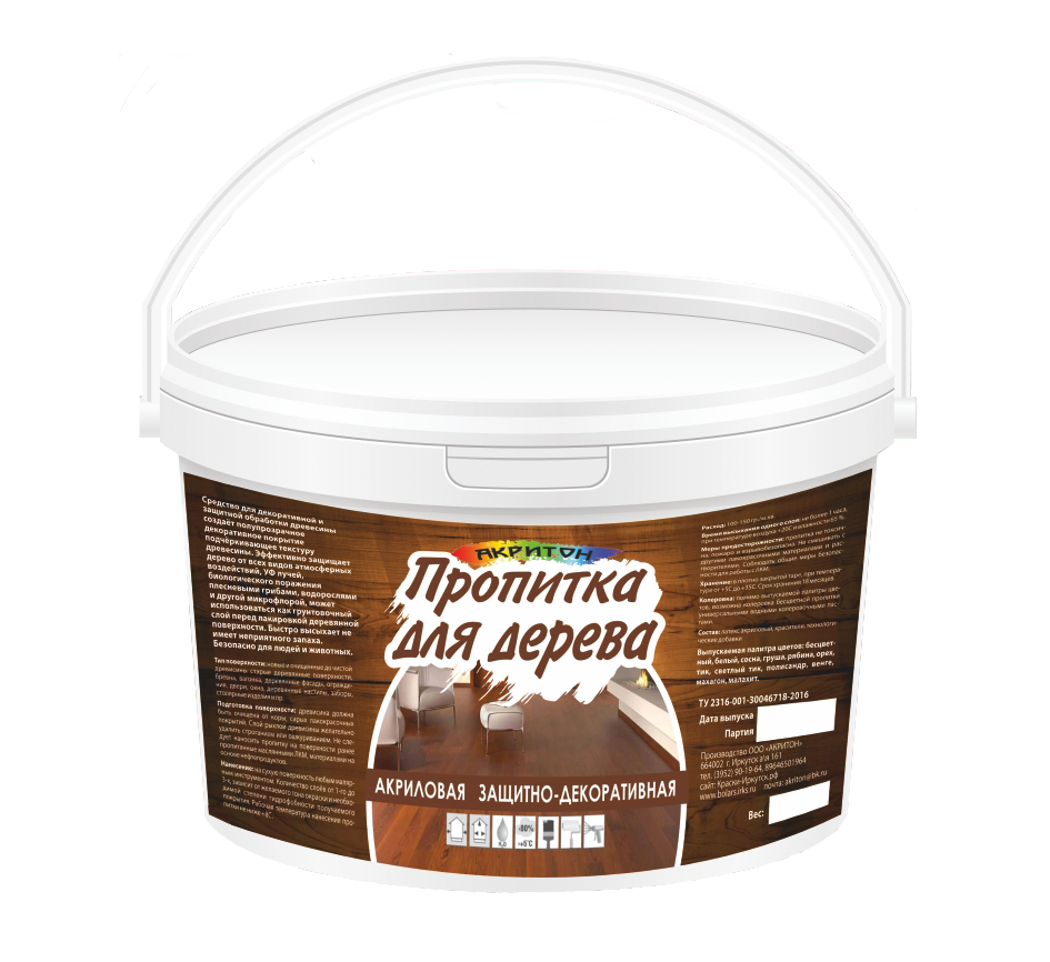 Назначение: Пропитка акриловая предназначен для наружных и внутренних работ по деревянным и другим поверхностям. Для придания поверхностям декоротивных и защитных свойств. После высыхания образует гладкую, стойкую к истиранию пленку. Пропитка обладает высокой водо - и атмосферостойкостью. Защищает поверхность от влаги, гниения, грибка, окисления, укрепляет поверхность, выделяет декоративную структуру дерева. Придаёт поверхности матовый, полуглянцевый, глянцевый блеск. Способ применения: Подготовка поверхности – Перед нанесением Пропитки необходимо ответственно подготовить поверхность. Поверхность должна быть чистой, прочной, сухой, очищенной от пыли, грязи, от отслоившейся и непрочно держащейся старой краски, при необходимости обезжирена. Поверхность рекомендуется покрыть Грунтовкой акриловой которая укрепит поверхность, придаст ей отличные поверхностно-сцепляющие свойства, увеличит адгезию (сцепление). Нанесение: Перед нанесением пропитку тщательно перемешать. Пропитку наносят кистью, валиком или краскопультом. Рекомендуется двухслойное нанесение, с сушкой между слоями –6ч. Для снижения вязкости пропитку можно разбовлять водой но не более 10% Свойства. Практически без запаха, нетоксичный, пожаро-взрывобезопасный, экологически безопасный материал. Условия нанесения. Температура воздуха и обрабатываемой поверхности - от +5oС до +35oС. , влажность воздуха - 65±5%. Время полного высыхания: На отлип – 1 часа. Для нанесения 2-го слоя – 5 часов. Полное – 24 часа. Расход: 150-200 г/м2 Срок годности.:1 год со дня изготовления. Хранение и транспортировка: В закрытой оригинальной упаковке при температуре от +5С до +30С. В *морозостойком исполнении возможно хранение и транспортировка при температуре до -25С не более одного месяца. Меры предосторожности. При попадании материала в глаза необходимо сразу промыть их большим количеством воды. При попадании эмали на кожу снять ее ватным тампоном и промыть загрязненный участок обильным количеством воды. Состав: Латекс акриловый, наполнители, загуститель, технологические добавки, колер, вода
