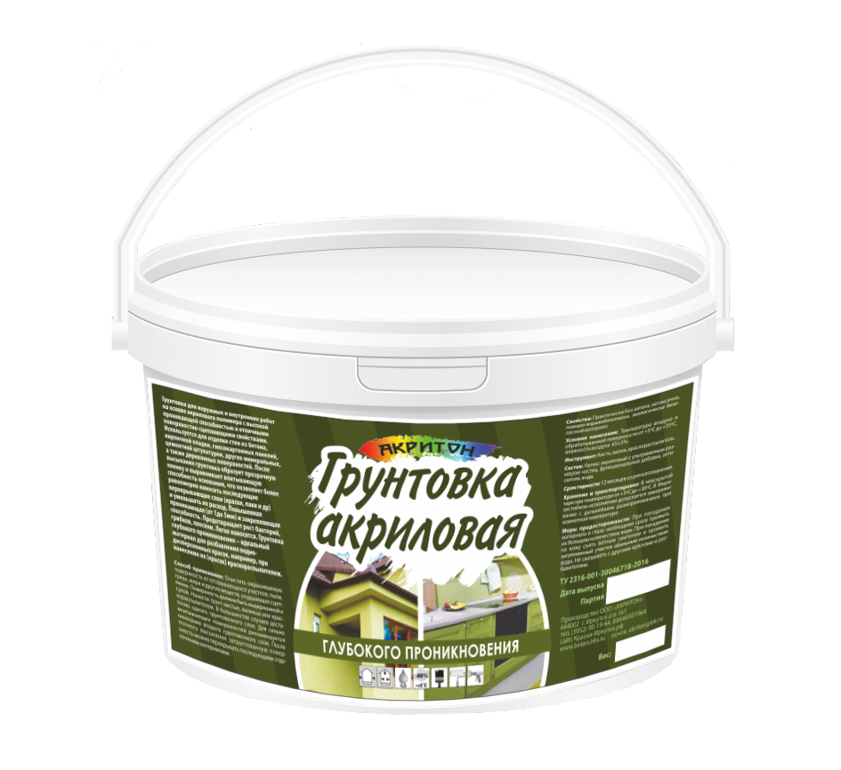 Назначение: Грунтовка для наружных и внутренних работ на основе акрилового полимера с высокой проникающей способностью и отличными поверхностно-сцепляющими свойствами. Используется для отделки стен из бетона, кирпичной кладки, гипсокартонных панелей, цементной штукатурки, других минеральных, а также деревянных поверхностей. После высыхания грунтовка образует прозрачную пленку и выравнивает впитывающую способность основания, что позволяет более равномерно наносить последующие перекрывающие слои (краски, лаки и др) и уменьшать их расход. Повышенная проникающая (от 1до 5мм) и закрепляющая способность. Предотвращает рост бактерий, грибков, плесени. Легко наносится. Грунтовка глубокого проникновения – идеальный материал для разбавления водно-дисперсионных красок, например, при нанесении их (красок) краскораспылителем. Способ применения: Очистить окрашиваемую поверхность от отслаивающихся участков, пыли, грязи, жира и других веществ, ухудшающих сцепление. Поверхность должна быть выдержанной и сухой. Нанести грунт кистью, валиком или краскораспылителем. В большинстве случаев достаточно одного грунтовочного слоя. Для сильно впитывающих поверхностей рекомендуется нанесение второго грунтовочного слоя. После полного высыхания загрунтованную поверхность можно перекрывать последующими отделочными материалами. Свойства: Практически без запаха, нетоксична, пожаро-взрывобезопасна, экологически безопасный материал. Условия нанесения: Температура воздуха и обрабатываемой поверхности от +5oС до +35oС. ,влажность воздуха 65±5%. Расход: 70-100 г/м2 (в зависимости от впитывающей способности) Высыхание: 3-5 часов при температуре воздуха +20* и относительной влажности 70% Инструмент: Кисть, валик, краскораспылитель. Состав: Латекс акриловый с ультрамелким размером частиц, функциональные добавки, антисептик, вода. Срок годности: 12 месяцев со дня изготовления. Хранение и транспортировка: В невскрытой таре при температуре от +5oС до +30oС. В *Морозостойком исполнении допускается замораживание с дальнейшим размораживанием при комнатной температуре. Меры предосторожности: При попадании материала в глаза необходимо сразу промыть их большим количеством воды. При попадании на кожу снять ватным тампоном и промыть загрязненный участок обильным количеством воды. Не смешивать с другими красками и разбавителями.